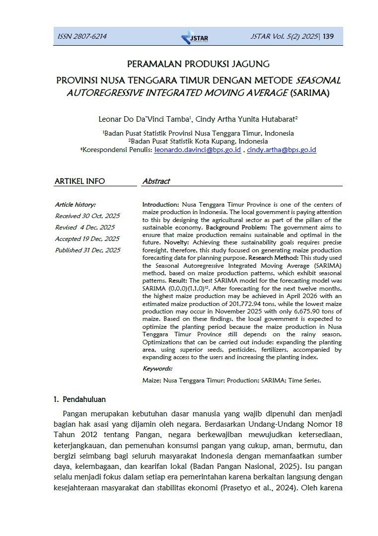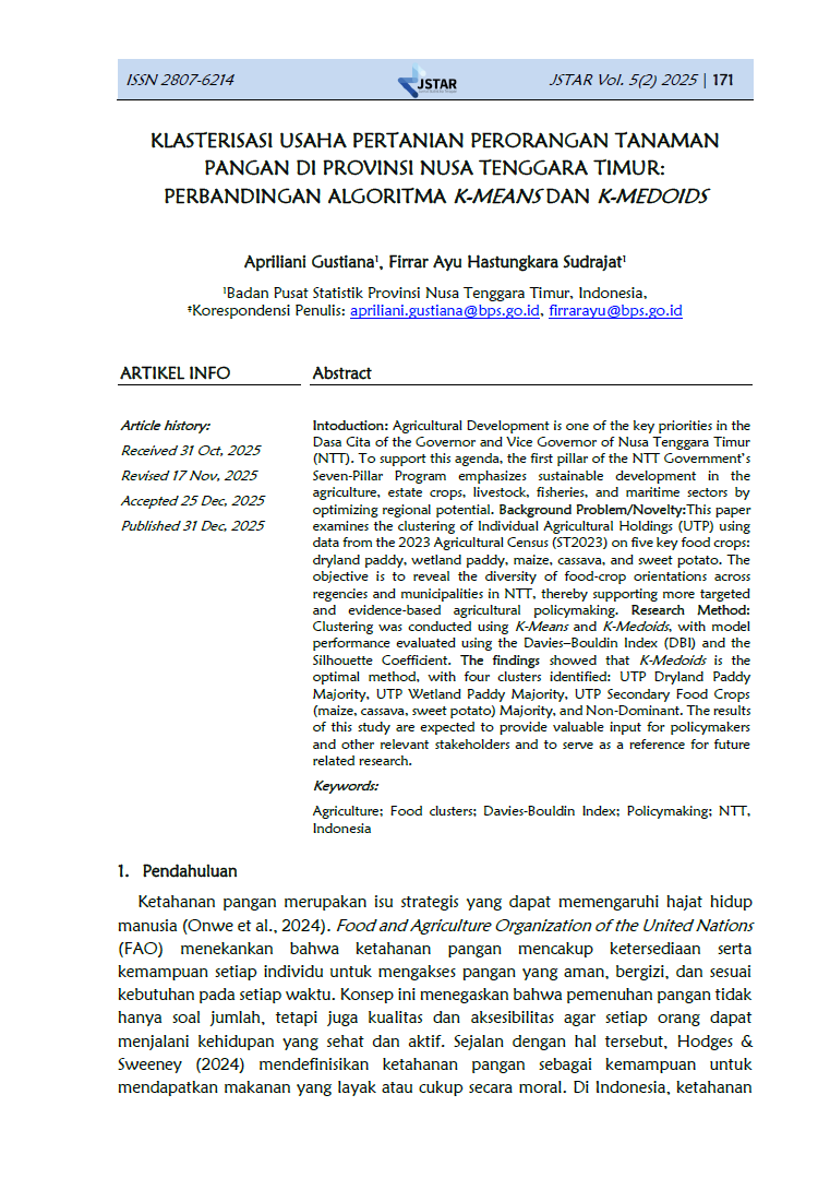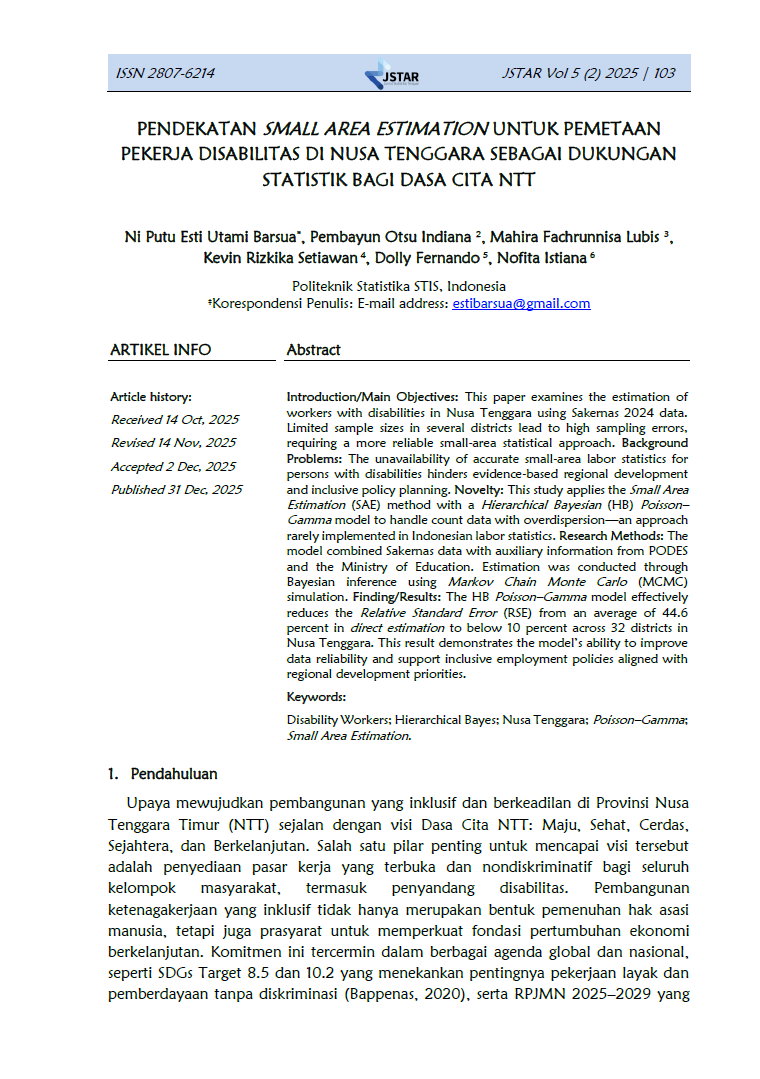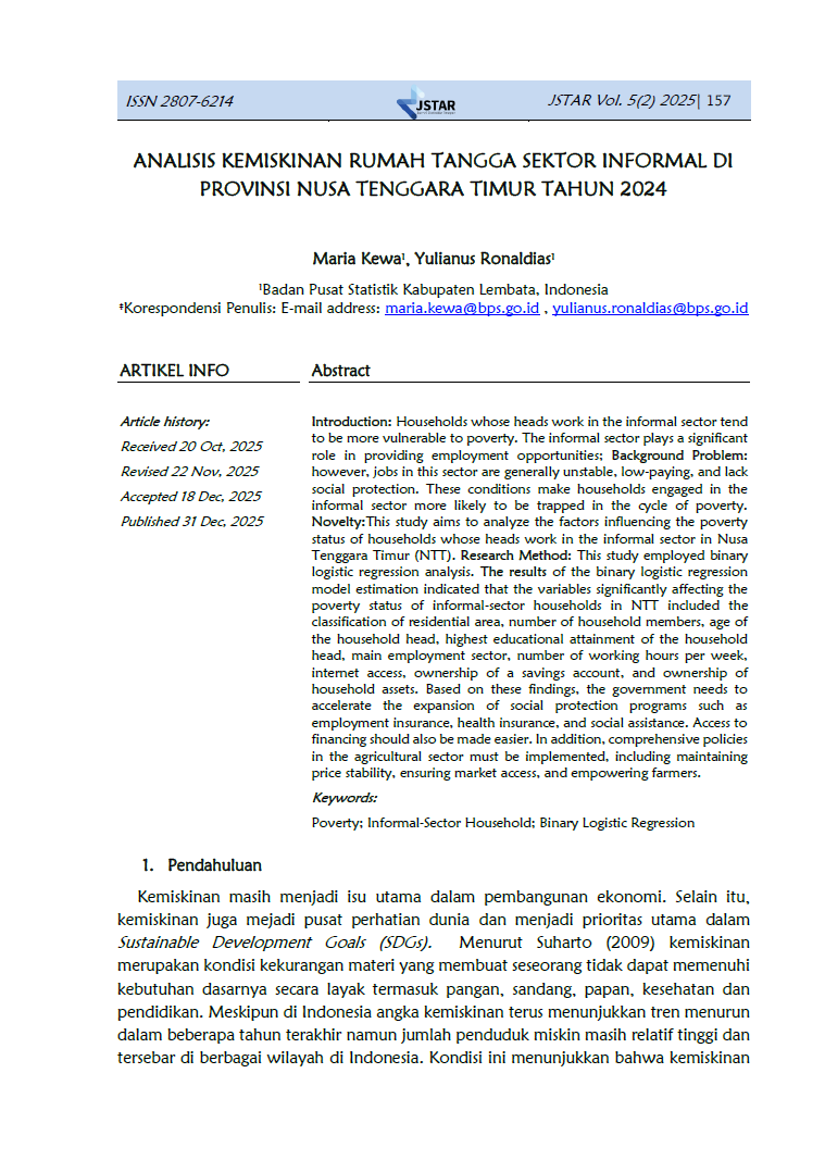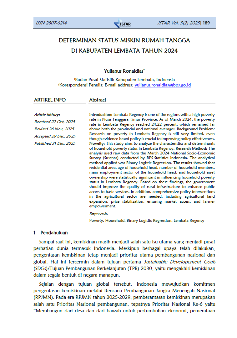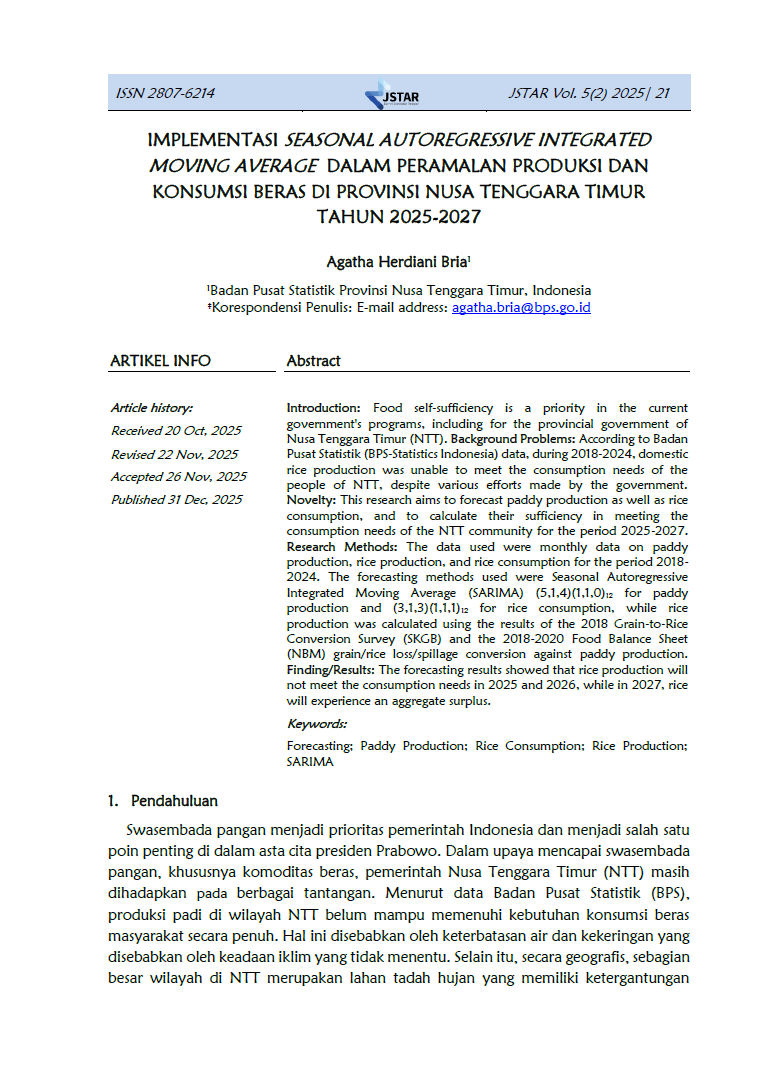 Jurnal Statistika Terapan (JSTAR) diterbitkan dua kali dalam satu tahun (Juni dan Desember) oleh Badan Pusat Statistik Provinsi NTT. JSTAR adalah media yang berisi kumpulan artikel tentang statisika terapan. Media ini bertujuan memberikan kesempatan bagi para peneliti, statistisi dan pranata komputer untuk berkontribusi dalam pembangunan daerah berdasarkan kajian statistika di berbagai bidang dengan memanfaatkan data-data yang dihasilkan oleh BPS Provinsi NTT. Artikel yang masuk dalam JSTAR akan dikaji secara profesional dengan metode double blind review untuk dapat menjaga objektifitas dan substansi artikel.