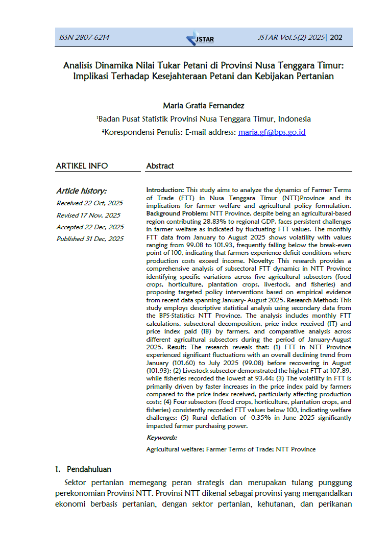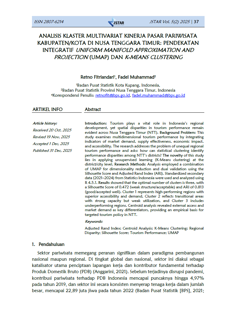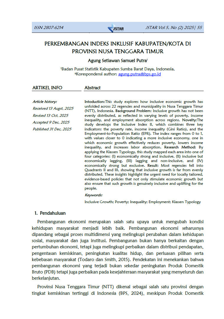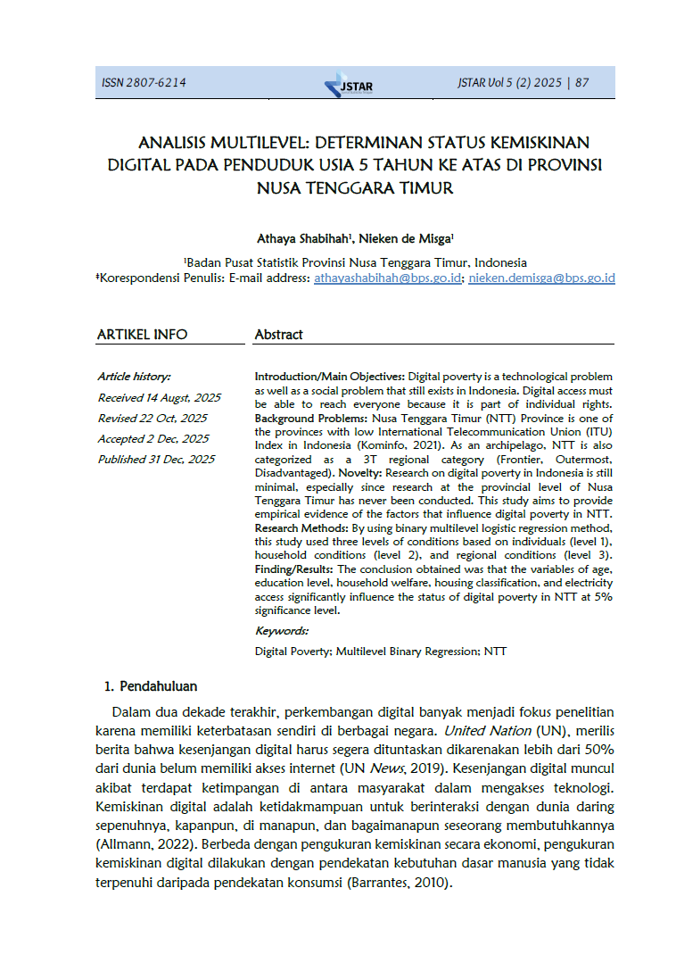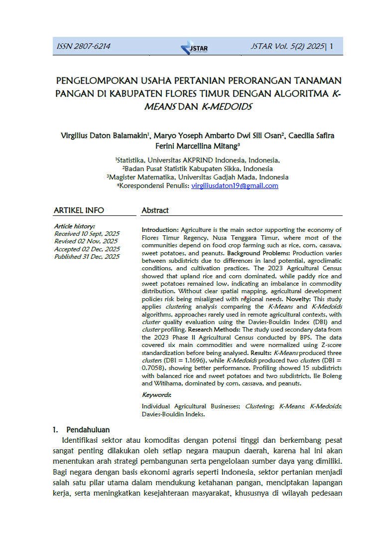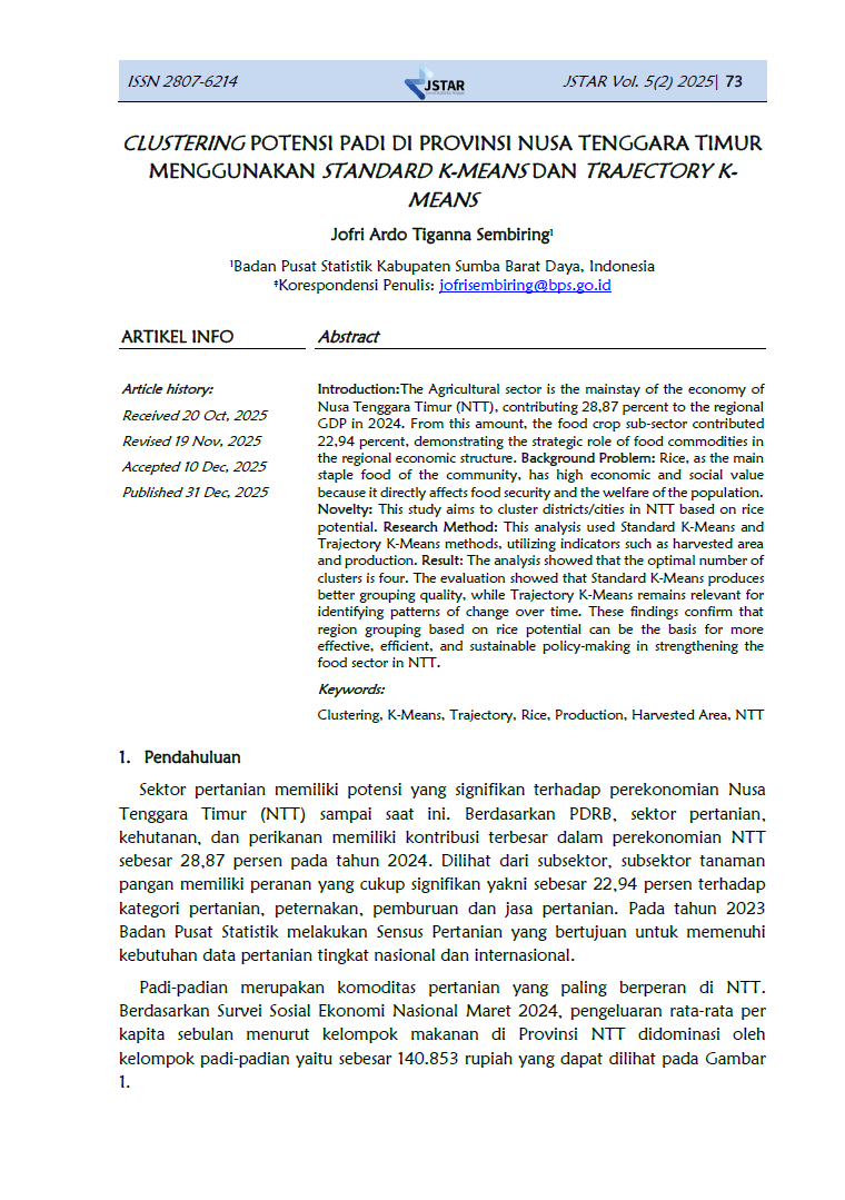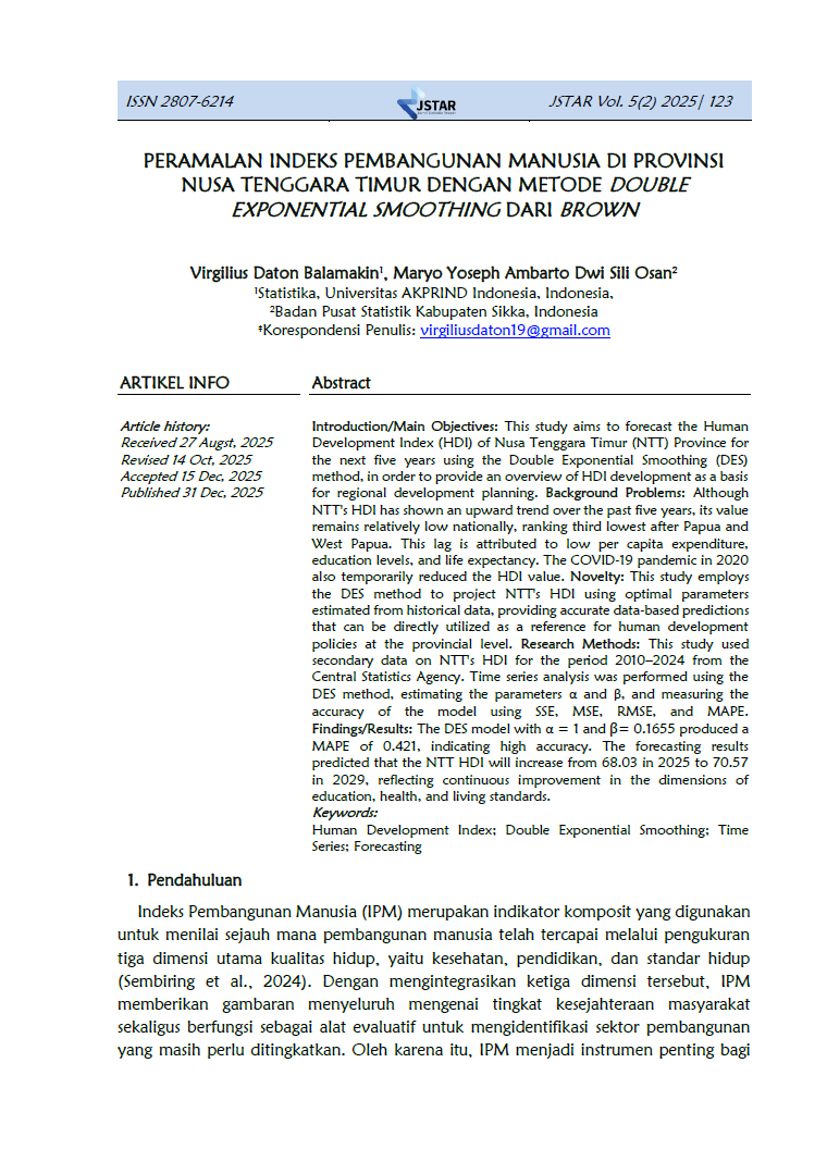 Jurnal Statistika Terapan (JSTAR) diterbitkan dua kali dalam satu tahun (Juni dan Desember) oleh Badan Pusat Statistik Provinsi NTT. JSTAR adalah media yang berisi kumpulan artikel tentang statisika terapan. Media ini bertujuan memberikan kesempatan bagi para peneliti, statistisi dan pranata komputer untuk berkontribusi dalam pembangunan daerah berdasarkan kajian statistika di berbagai bidang dengan memanfaatkan data-data yang dihasilkan oleh BPS Provinsi NTT. Artikel yang masuk dalam JSTAR akan dikaji secara profesional dengan metode double blind review untuk dapat menjaga objektifitas dan substansi artikel.